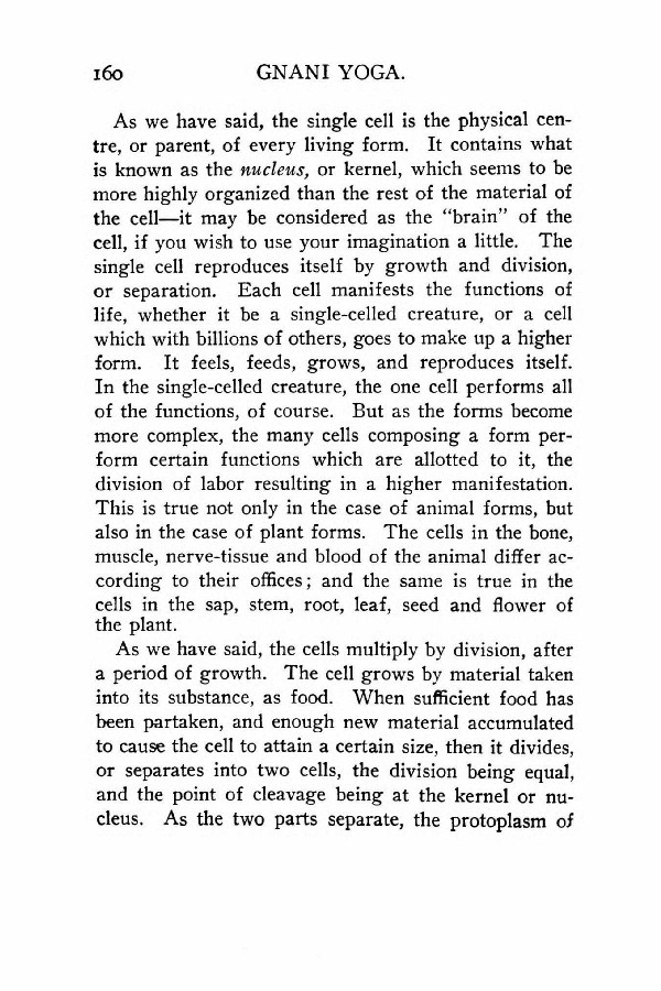 As we have said, the single cell is the physical centre, or parent, of every living form. It contains what is known as the nucleus, or kernel, which seems to be more highly organized than the rest of the material of the cell --- it may be considered as the "brain" of the cell, if you wish to use your imagination a little. The single cell reproduces itself by growth and division, or separation. Each cell manifests the functions of life, whether it be a single-celled creature, or a cell which with billions of others, goes to make up a higher form. It feels, feeds, grows, and reproduces itself. In the single-celled creature, the one cell performs all of the functions, of course. But as the forms become more complex, the many cells composing a form perform certain functions which are allotted to it, the division of labor resulting in a higher manifestation. This is true not only in the case of animal forms, but also in the case of plant forms. The cells in the bone, muscle, nerve-tissue and blood of the animal differ according to their offices; and the same is true in the cells in the sap, stem, root, leaf, seed and flower of the plant.