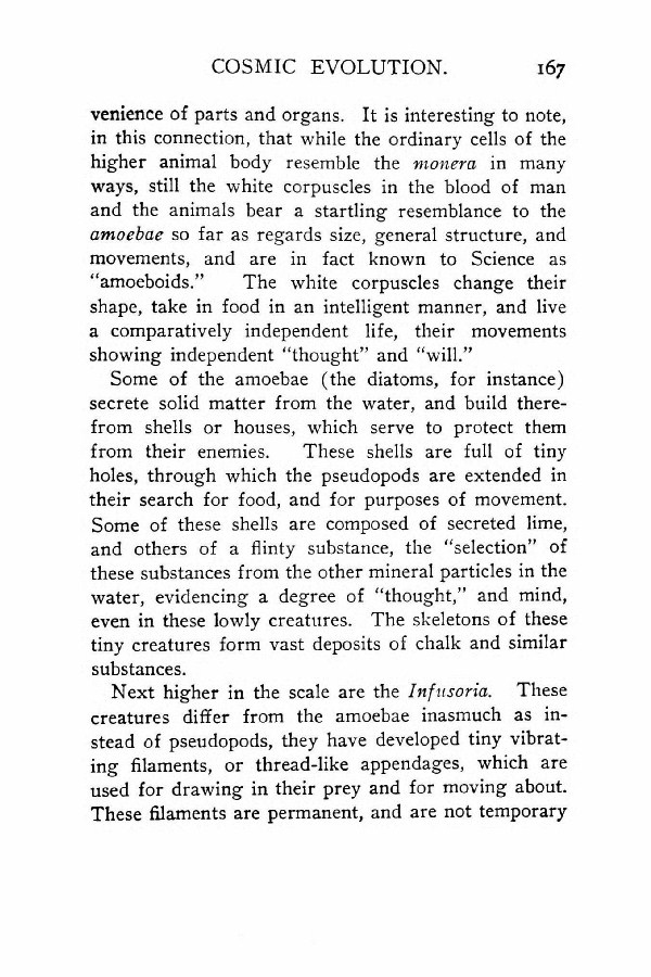 of parts and organs. It is interesting to note, in this connection, that while the ordinary cells of the higher animal body resemble the monera in many ways, still the white corpuscles in the blood of man and the animals bear a startling resemblance to the amoebae so far as regards size, general structure, and movements, and are in fact known to Science as "amoeboids." The white corpuscles change their shape, take in food in an intelligent manner, and live a comparatively independent life, their movements showing independent "thought" and "will."
