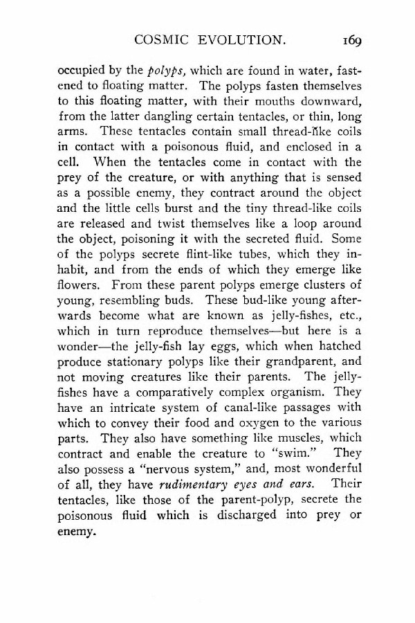 occupied by the polyps, which are found in water, fastened to floating matter. The polyps fasten themselves to this floating matter, with their mouths downward, from the latter dangling certain tentacles, or thin, long arms. These tentacles contain small threadlike coils in contact with a poisonous fluid, and enclosed in a cell. When the tentacles come in contact with the prey of the creature, or with anything that is sensed as a possible enemy, they contract around the object and the little cells burst and the tiny thread-like coils are released and twist themselves like a loop around the object, poisoning it with the secreted fluid. Some of the polyps secrete flint-like tubes, which they inhabit, and from the ends of which they emerge like flowers. From these parent polyps emerge clusters of young, resembling buds. These bud-like young afterwards become what are known as jelly-fishes, etc., which in turn reproduce themselves --- but here is a wonder --- the jelly-fish lay eggs, which when hatched produce stationary polyps like their grandparent, and not moving creatures like their parents. The jellyfishes have a comparatively complex organism. They have an intricate system of canal-like passages with which to convey their food and oxygen to the various parts. They also have something like muscles, which contract and enable the creature to "swim." They also possess a "nervous system," and, most wonderful of all, they have rudimentary eyes and ears. Their tentacles, like those of the parent-polyp, secrete the poisonous fluid which is discharged into prey or enemy.