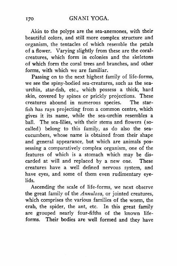 Ascending the scale of life-forms, we next observe the great family of the Annulosa, or jointed creatures, which comprises the various families of the worm, the crab, the spider, the ant, etc. In this great family are grouped nearly four-fifths of the known life forms. Their bodies are well formed and they have