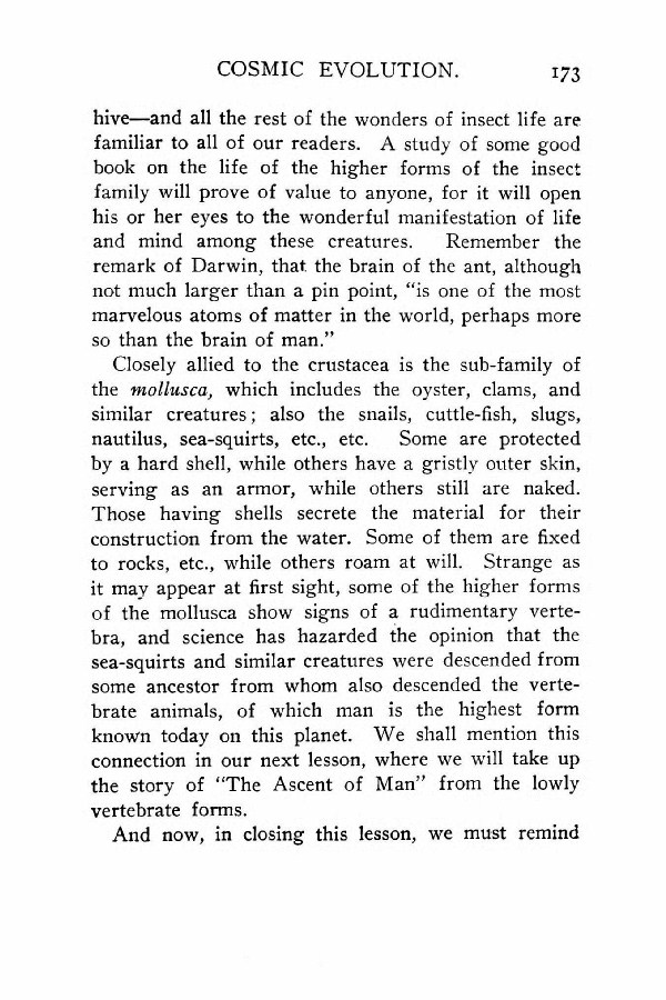Closely allied to the Crustacea is the sub-family of the mollusca, which includes the oyster, clams, and similar creatures; also the snails, cuttle-fish, slugs, nautilus, sea-squirts, etc., etc. Some are protected by a hard shell, while others have a gristly outer skin, serving as an armor, while others still are naked. Those having shells secrete the material for their construction from the water. Some of them are fixed to rocks, etc., while others roam at will. Strange as it may appear at first sight, some of the higher forms of the mollusca show signs of a rudimentary vertebra, and science has hazarded the opinion that the sea-squirts and similar creatures were descended from some ancestor from whom also descended the vertebrate animals, of which man is the highest form known today on this planet. We shall mention this connection in our next lesson, where we will take up the story of "The Ascent of Man" from the lowly vertebrate forms.