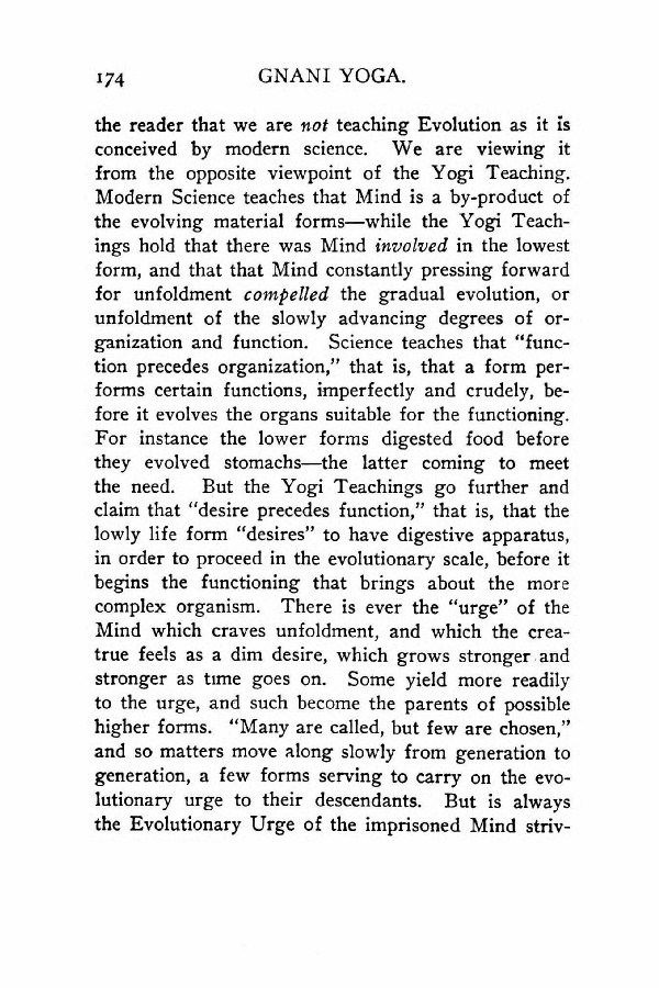 the reader that we are not teaching Evolution as it is conceived by modern science. We are viewing it from the opposite viewpoint of the Yogi Teaching. Modern Science teaches that Mind is a by-product of the evolving material forms --- while the Yogi Teachings hold that there was Mind involved in the lowest form, and that that Mind constantly pressing forward for unfoldment compelled the gradual evolution, or unfoldment of the slowly advancing degrees of organization and function. Science teaches that "function precedes organization," that is, that a form performs certain functions, imperfectly and crudely, before it evolves the organs suitable for the functioning. For instance the lower forms digested food before they evolved stomachs --- the latter coming to meet the need. But the Yogi Teachings go further and claim that "desire precedes function," that is, that the lowly life form "desires" to have digestive apparatus, in order to proceed in the evolutionary scale, before it begins the functioning that brings about the more complex organism. There is ever the "urge" of the Mind which craves unfoldment, and which the creature feels as a dim desire, which grows stronger and stronger as time goes on. Some yield more readily to the urge, and such become the parents of possible higher forms. "Many are called, but few are chosen," and so matters move along slowly from generation to generation, a few forms serving to carry on the evolutionary urge to their descendants. But is always the Evolutionary Urge of the imprisoned Mind striving