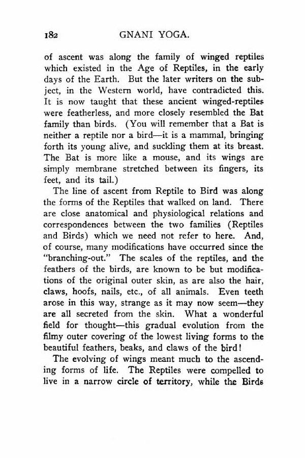 of ascent was along the family of winged reptiles which existed in the Age of Reptiles, in the early days of the Earth. But the later writers on the subject, in the Western world, have contradicted this. It is now taught that these ancient winged-reptiles were featherless, and more closely resembled the Bat family than birds. (You will remember that a Bat is neither a reptile nor a bird --- it is a mammal, bringing forth its young alive, and suckling them at its breast. The Bat is more like a mouse, and its wings are simply membrane stretched between its fingers, its feet, and its tail.)