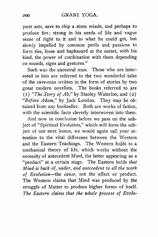 And now in conclusion before we pass on the subject of "Spiritual Evolution," which will form the subject of our next lesson, we would again call your attention to the vital difference between the Western and the Eastern Teachings. The Western holds to a mechanical theory of life, which works without the necessity of antecedent Mind, the latter appearing as a "product" at a certain stage. The Eastern holds that Mind is back of, under, and antecedent to all the work of Evolution --- the cause, not the effect or product. The Western claims that Mind was produced by the struggle of Matter to produce higher forms of itself. The Eastern claims that the whole process of Evolution
