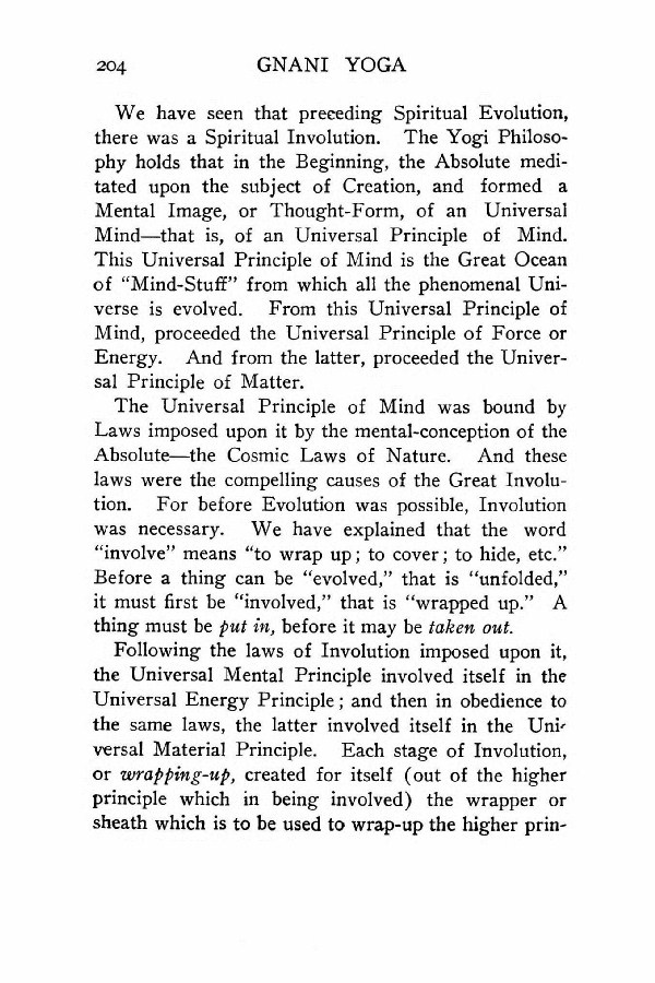 We have seen that preceding Spiritual Evolution, there was a Spiritual Involution. The Yogi Philosophy holds that in the Beginning, the Absolute meditated upon the subject of Creation, and formed a Mental Image, or Thought-Form, of an Universal Mind --- that is, of an Universal Principle of Mind. This Universal Principle of Mind is the Great Ocean of "Mind-Stuff" from which all the phenomenal Universe is evolved. From this Universal Principle of Mind, proceeded the Universal Principle of Force or Energy. And from the latter, proceeded the Universal Principle of Matter.