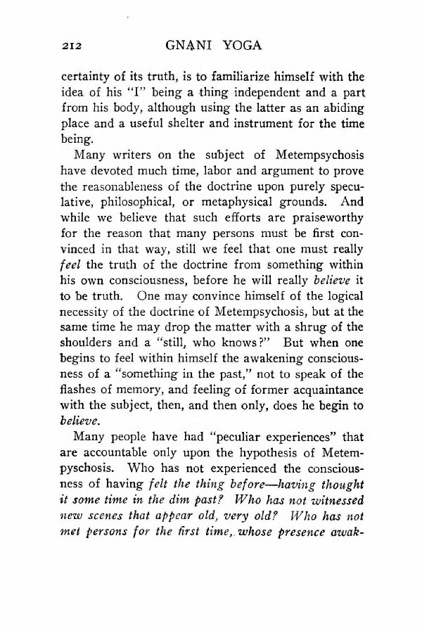 Many writers on the subject of Metempsychosis have devoted much time, labor and argument to prove the reasonableness of the doctrine upon purely speculative, philosophical, or metaphysical grounds. And while we believe that such efforts are praiseworthy for the reason that many persons must be first convinced in that way, still we feel that one must really feelthe truth of the doctrine from something within his own consciousness, before he will reallybelieve it to be truth. One may convince himself of the logical necessity of the doctrine of Metempsychosis, but at the same time he may drop the matter with a shrug of the shoulders and a "still, who knows?" But when one begins to feel within himself the awakening consciousness of a "something in the past," not to speak of the flashes of memory, and feeling of former acquaintance with the subject, then, and then only, does he begin to believe.