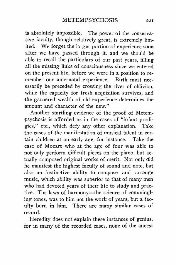 manifested any talent or ability. From whom did Shakespeare inherit his genius? From whom did Plato derive his wonderful thought? From what ancestor did Abraham Lincoln inherit his character --- coming from a line of plain, poor, hard-working people, and possessing all of the physical attributes and characteristics of his ancestry, he, nevertheless, manifested a mind which placed him among the foremost of his race. Does not Metempsychosis give us the only possible key? Is it not reasonable to suppose that the abilities displayed by the infant genius, and the talent of the men who spring from obscure origin, have their root in the experiences of a previous life? Then take the cases of children at school. Children of even the same family manifest different degrees of receptivity to certain studies. Some "take to" one thing, and some to another. Some find arithmetic so easy that they almost absorb it intuitively, while grammar is a hard task for them; while their brothers and sisters find the exact reverse to be true. How many have found that when they would take up some new study, it is almost like recalling something already learned. Do you student, who are now reading these lines take your own case. Does not all this Teaching seem to you like the repetition of some lesson learned long ago? Is it not like remembering something already learned, rather than the learning of some new truth? Were you not attracted to these studies, in the first place, by a feeling that you had known it all before, somewhere, somehow? Does not your mind