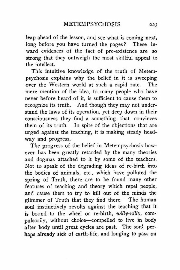 The progress of the belief in Metempsychosis however has been greatly retarded by the many theories and dogmas attached to it by some of the teachers. Not to speak of the degrading ideas of re-birth into the bodies of animals, etc., which have polluted the spring of Truth, there are to be found many other features of teaching and theory which repel people, and cause them to try to kill out of the minds the glimmer of Truth that they find there. The human soul instinctively revolts against the teaching that it is bound to the wheel or re-birth, willy-nilly, compulsorily, without choice --- compelled to live in body after body until great cycles are past. The soul, perhaps already sick of earth-life, and longing to pass on