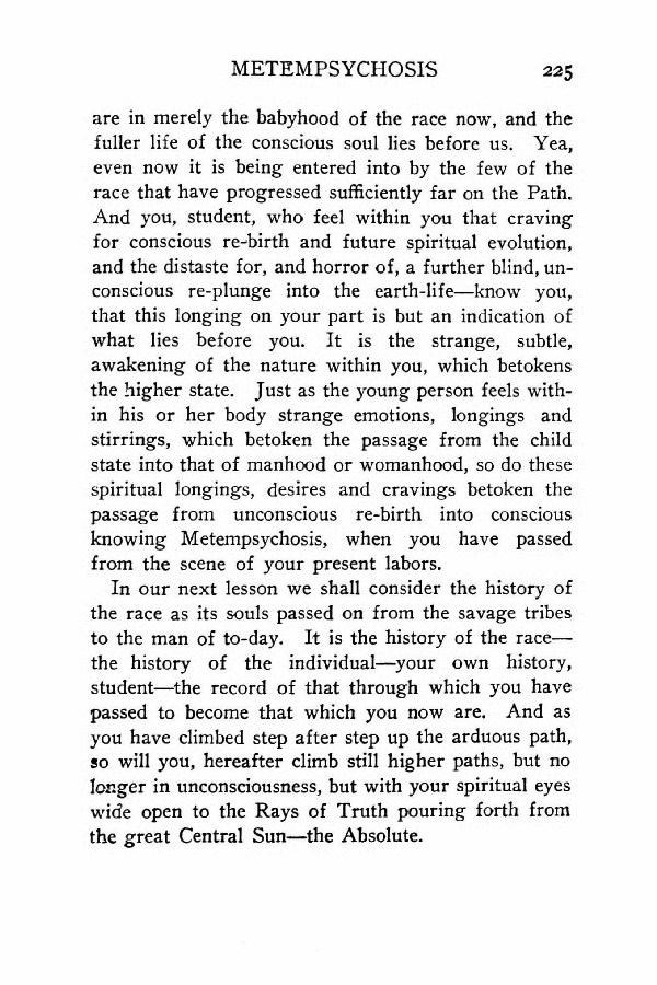 are in merely the babyhood of the race now, and the fuller life of the conscious soul lies before us. Yea, even now it is being entered into by the few of the race that have progressed sufficiently far on the Path. And you, student, who feel within you that craving for conscious re^birth and future spiritual evolution, and the distaste for, and horror of, a further blind, unconscious re-plunge into the earth-life --- know you, that this longing on your part is but an indication of what lies before you. It is the strange, subtle, awakening of the nature within you, which betokens the higher state. Just as the young person feels within his or her body strange emotions, longings and stirrings, which betoken the passage from the child state into that of manhood or womanhood, so do these spiritual longings, desires and cravings betoken the passage from unconscious re-birth into conscious knowing Metempsychosis, when you have passed from the scene of your present labors.