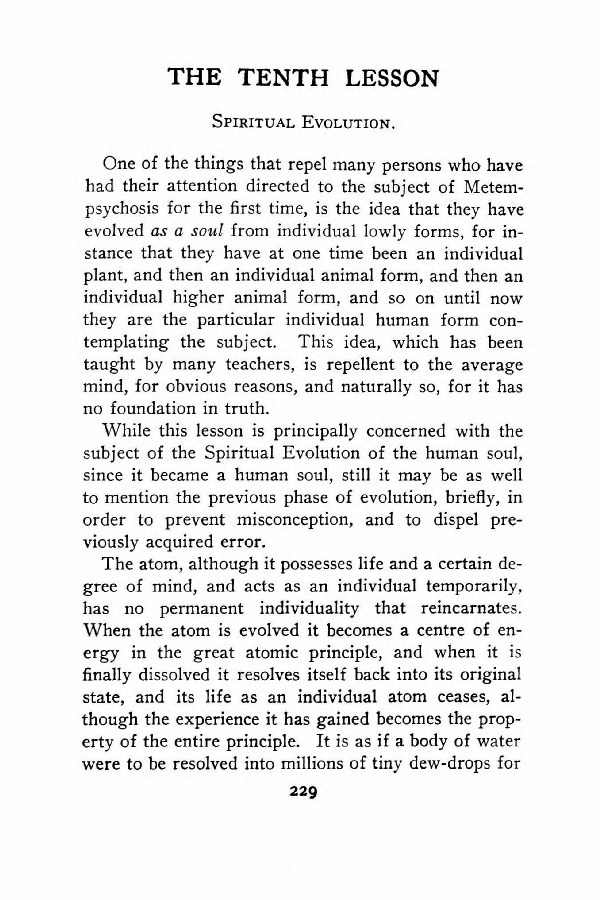 One of the things that repel many persons who have had their attention directed to the subject of Metempsychosis for the first time, is the idea that they have evolved as a soul from individual lowly forms, for instance that they have at one time been an individual plant, and then an individual animal form, and then an individual higher animal form, and so on until now they are the particular individual human form contemplating the subject. This idea, which has been taught by many teachers, is repellent to the average mind, for obvious reasons, and naturally so, for it has no foundation in truth.