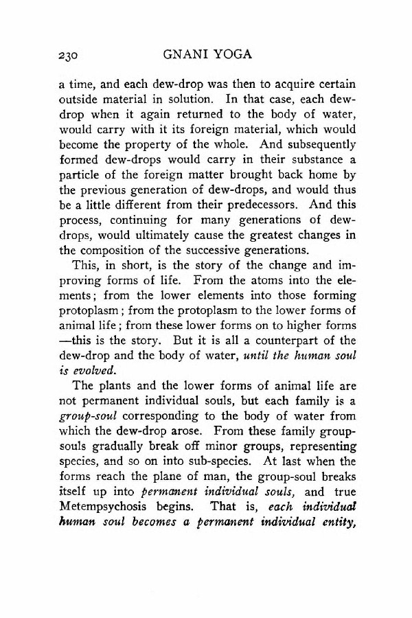 The plants and the lower forms of animal life are not permanent individual souls, but each family is a group-soul corresponding to the body of water from which the dew-drop arose. From these family group souls gradually break off minor groups, representing species, and so on into sub-species. At last when the forms reach the plane of man, the group-soul breaks itself up intopermanent individual souls, and true Metempsychosis begins. That is, each individual human soul becomes a permanent individual entity,