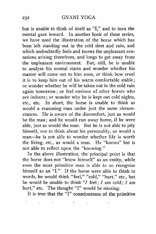 but is unable to think of itself as "I," and to turn the mental gaze inward. In another book of these series, we have used the illustration of the horse which has been left standing out in the cold sleet and rain, and which undoubtedly feels and knows the unpleasant sensations arising therefrom, and longs to get away from the unpleasant environment. But, still, he is unable to analyze his mental states and wonder whether his master will come out to him soon, or think how cruel it is to keep him out of his warm comfortable stable; or wonder whether he will be taken out in the cold rain again tomorrow; or feel envious of other horses who are indoors; or wonder why he is kept out cold nights, etc., etc. In short, the horse is unable to think as would a reasoning man under just the same circumstances. He is aware of the discomfort, just as would be the man; and he would run away home, if he were able, just as would the man. But he is not able to pity himself, nor to think about his personality, as would a man --- he is not able to wonder whether life is worth the living, etc., as would a man. He "knows" but is not able to reflect upon the "knowing."