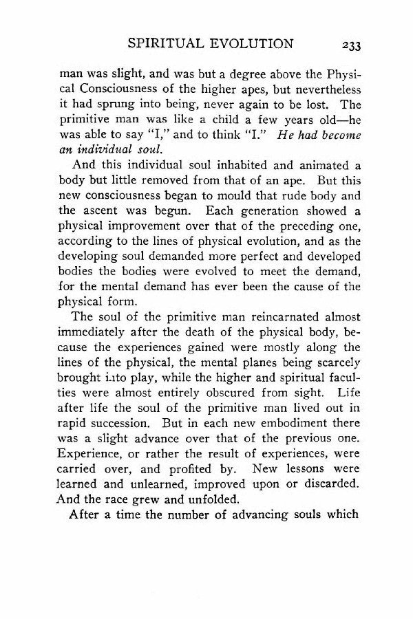 man was slight, and was but a degree above the Physical Consciousness of the higher apes, but nevertheless it had sprung into being, never again to be lost. The primitive man was like a child a few years old --- he was able to say "I," and to think "I." He had become an individual soul.