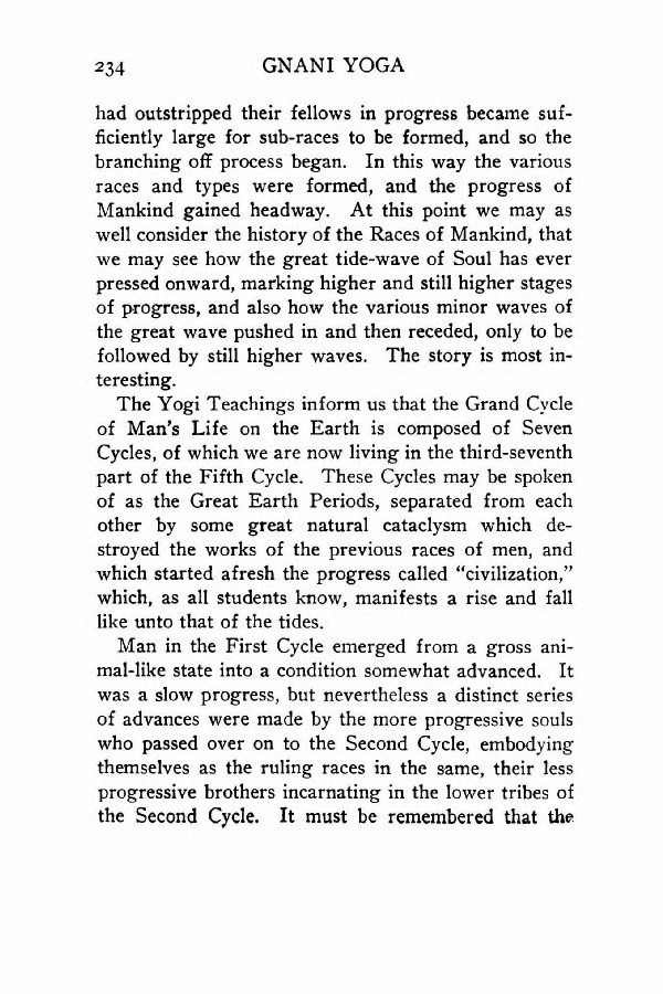 The Yogi Teachings inform us that the Grand Cycle of Man's Life on the Earth is composed of Seven Cycles, of which we are now living in the third-seventh part of the Fifth Cycle. These Cycles may be spoken of as the Great Earth Periods, separated from each other by some great natural cataclysm which destroyed the works of the previous races of men, and which started afresh the progress called "civilization," which, as all students know, manifests a rise and fall like unto that of the tides.