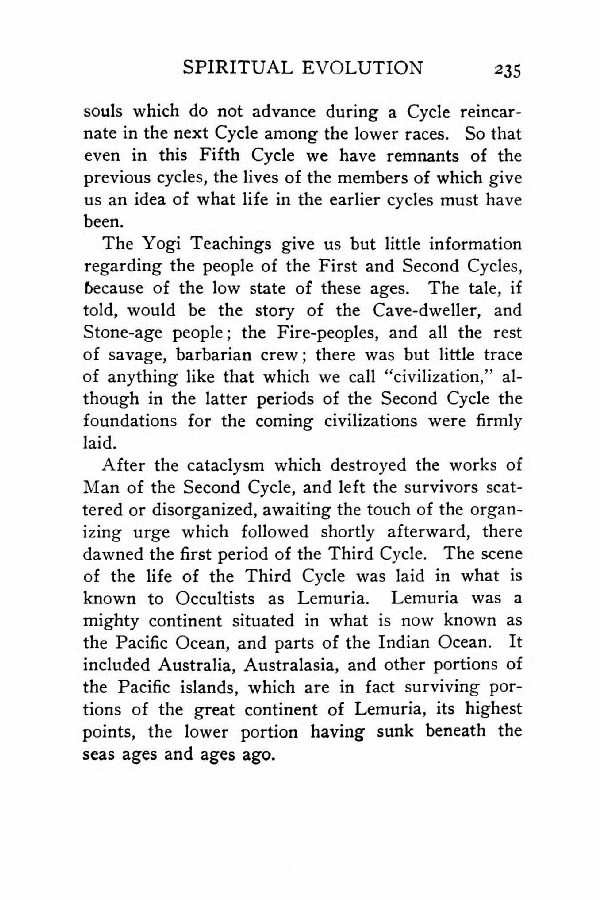 The Yogi Teachings give us but little information regarding the people of the First and Second Cycles, because of the low state of these ages. The tale, if told, would be the story of the Cave-dweller, and Stone-age people; the Fire-peoples, and all the rest of savage, barbarian crew; there was but little trace of anything like that which we call "civilization," although in the latter periods of the Second Cycle the foundations for the coming civilizations were firmly laid.