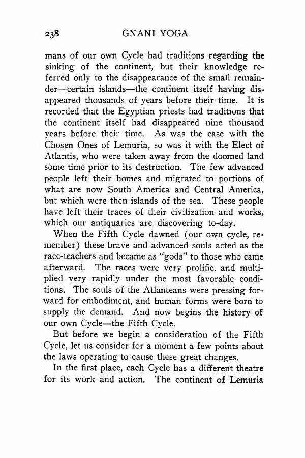 of our own Cycle had traditions regarding the sinking of the continent, but their knowledge referred only to the disappearance of the small remainder --- certain islands --- the continent itself having disappeared thousands of years before their time. It is recorded that the Egyptian priests had traditions that the continent itself had disappeared nine thousand years before their time. As was the case with the Chosen Ones of Lemuria, so was it with the Elect of Atlantis, who were taken away from the doomed land some time prior to its destruction. The few advanced people left their homes and migrated to portions of what are now South America and Central America, but which were then islands of the sea. These people have left their traces of their civilization and works, which our antiquaries are discovering to-day.