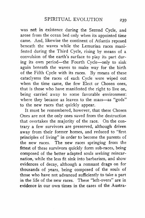 It must be remembered, however, that these Chosen Ones are not the only ones saved from the destruction that overtakes the majority of the race. On the contrary a few survivors are preserved, although driven away from their former homes, and reduced to "first principles of living" in order to become the parents of the new races. The new races springing from the fittest of these survivors quickly form sub-races, being composed of the better adapted souls seeking reincarnation, while the less fit sink into barbarism, and show evidences of decay, although a remnant drags on for thousands of years, being composed of the souls of those who have not advanced sufficiently to take a part in the life of the new races. These "left-overs" are in evidence in our own times in the cases of the Australian