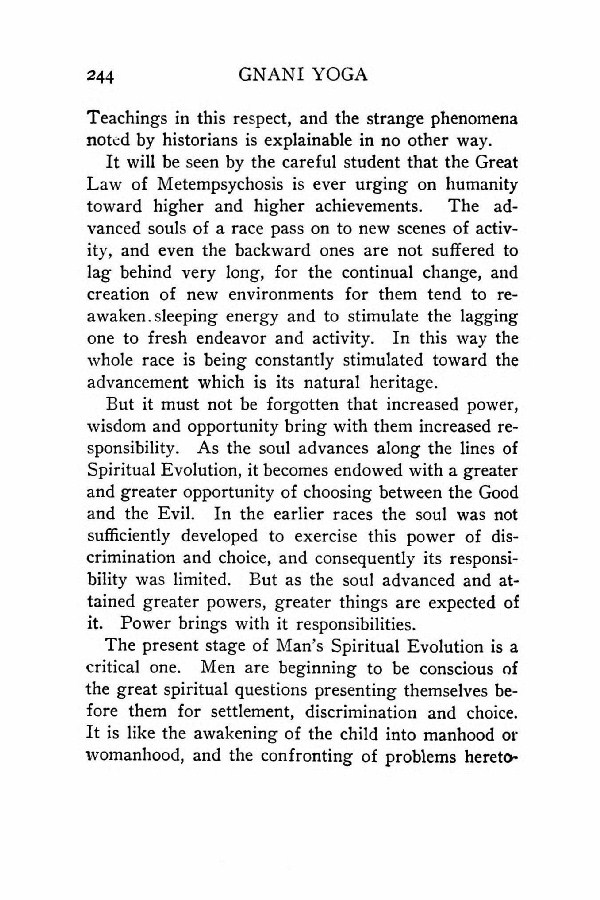 But it must not be forgotten that increased power, wisdom and opportunity bring with them increased responsibility. As the soul advances along the lines of Spiritual Evolution, it becomes endowed with a greater and greater opportunity of choosing between the Good and the Evil. In the earlier races the soul was not sufficiently developed to exercise this power of discrimination and choice, and consequently its responsibility was limited. But as the soul advanced and attained greater powers, greater things are expected of it. Power brings with it responsibilities.