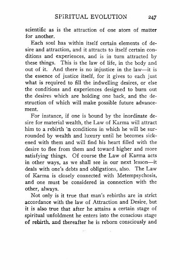 For instance, if one is bound by the inordinate desire for material wealth, the Law of Karma will attract him to a rebirth 'n conditions in which he will be surrounded by wealth and luxury until he becomes sickened with them and will find his heart filled with the desire to flee from them and toward higher and more satisfying things. Of course the Law of Karma acts in other ways, as we shall see in our next lesson --- it deals with one's debts and obligations, also. The Law of Karma is closely connected with Metempsychosis, and one must be considered in connection with the other, always.