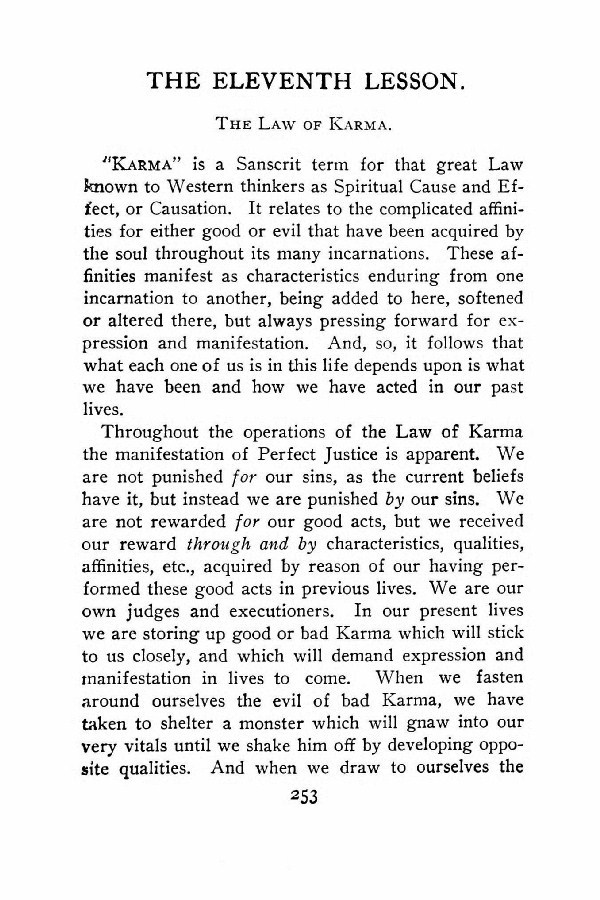 "Karma" is a Sanscrit term for that great Law known to Western thinkers as Spiritual Cause and Effect, or Causation. It relates to the complicated affinities for either good or evil that have been acquired by the soul throughout its many incarnations. These affinities manifest as characteristics enduring from one incarnation to another, being added to here, softened or altered there, but always pressing forward for expression and manifestation. And, so, it follows that what each one of us is in this life depends upon is what we have been and how we have acted in our past lives.