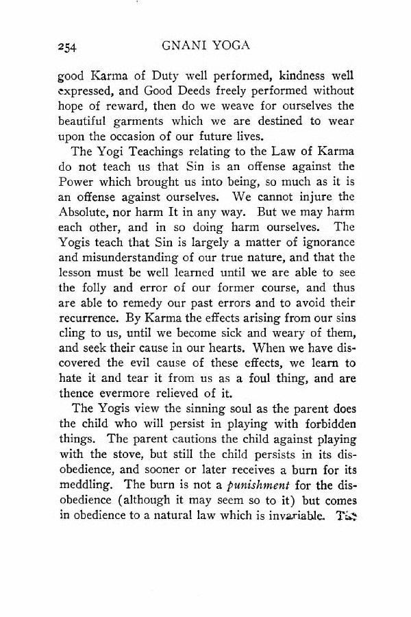 The Yogi Teachings relating to the Law of Karma do not teach us that Sin is an offense against the Power which brought us into being, so much as it is an offense against ourselves. We cannot injure the Absolute, nor harm It in any way. But we may harm each other, and in so doing harm ourselves. The Yogis teach that Sin is largely a matter of ignorance and misunderstanding of our true nature, and that the lesson must be well learned until we are able to see the folly and error of our former course, and thus are able to remedy our past errors and to avoid their recurrence. By Karma the effects arising from our sins cling to us, until we become sick and weary of them, and seek their cause in our hearts. When we have discovered the evil cause of these effects, we learn to hate it and tear it from us as a foul thing, and are thence evermore relieved of it.