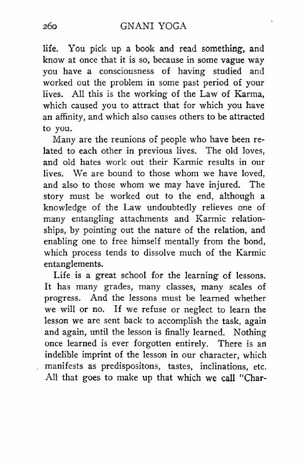 life. You pick up a book and read something, and know at once that it is so, because in some vague way you have a consciousness of having studied and worked out the problem in some past period of your lives. All this is the working of the Law of Karma, which caused you to attract that for which you have an affinity, and which also causes others to be attracted to you.