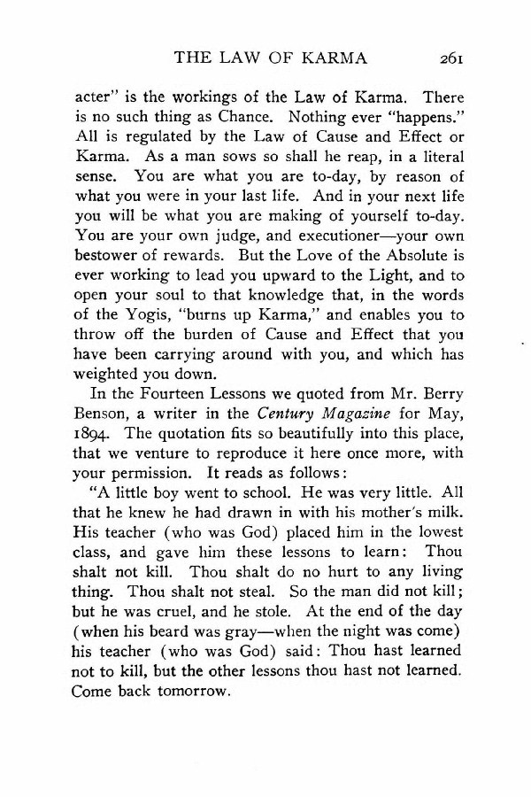 is the workings of the Law of Karma. There is no such thing as Chance. Nothing ever "happens." All is regulated by the Law of Cause and Effect or Karma. As a man sows so shall he reap, in a literal sense. You are what you are to-day, by reason of what you were in your last life. And in your next life you will be what you are making of yourself to-day. You are your own judge, and executioner --- your own bestower of rewards. But the Love of the Absolute is ever working to lead you upward to the Light, and to open your soul to that knowledge that, in the words of the Yogis, "burns up Karma," and enables you to throw off the burden of Cause and Effect that you have been carrying around with you, and which has weighted you down.
