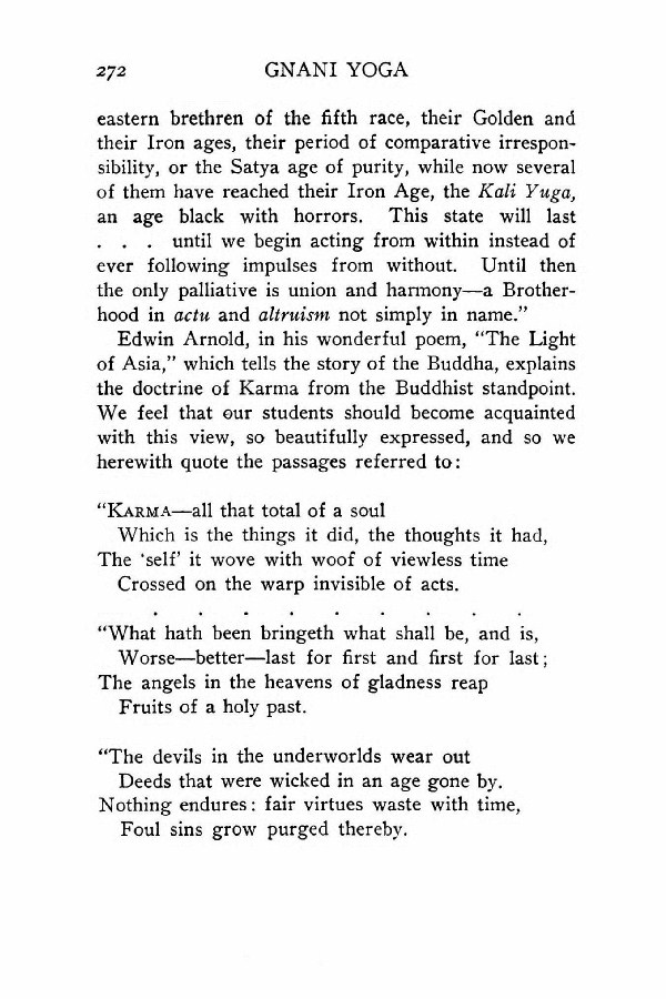 eastern brethren of the fifth race, their Golden and their Iron ages, their period of comparative irresponsibility, or the Satya age of purity, while now several of them have reached their Iron Age, the Kali Yuga, an age black with horrors. This state will last . . . until we begin acting from within instead of ever following impulses from without. Until then the only palliative is union and harmony --- a Brotherhood in actu and altruism not simply in name."
