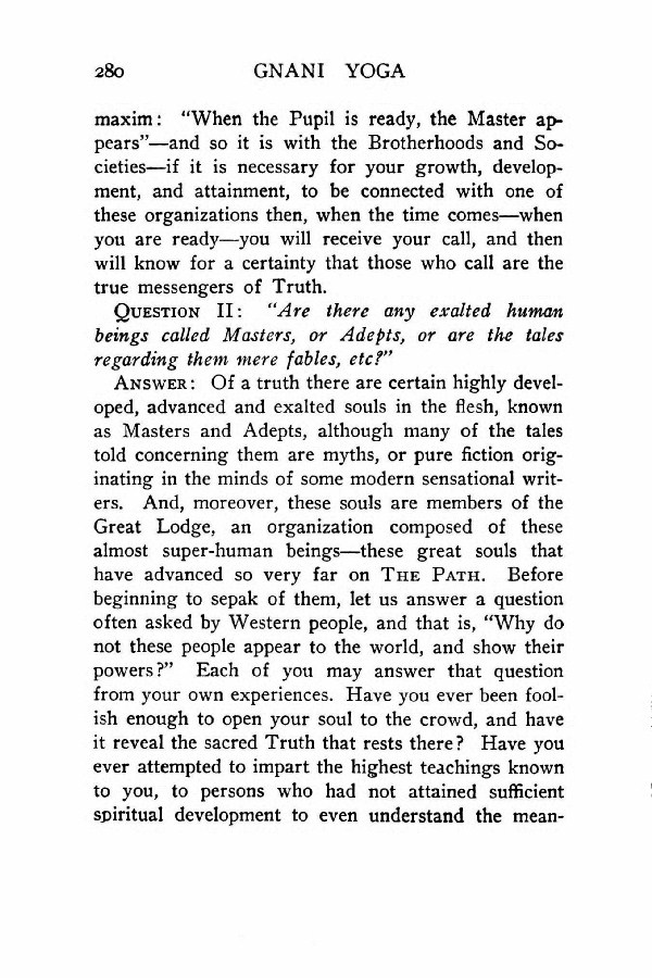 Answer: Of a truth there are certain highly developed, advanced and exalted souls in the flesh, known as Masters and Adepts, although many of the tales told concerning them are myths, or pure fiction originating in the minds of some modern sensational writers. And, moreover, these souls are members of the Great Lodge, an organization composed of these almost super-human beings --- these great souls that have advanced so very far on The Path. Before beginning to speak of them, let us answer a question often asked by Western people, and that is, "Why do not these people appear to the world, and show their powers?" Each of you may answer that question from your own experiences. Have you ever been foolish enough to open your soul to the crowd, and have it reveal the sacred Truth that rests there? Have you ever attempted to impart the highest teachings known to you, to persons who had not attained sufficient spiritual development to even understand the meaning