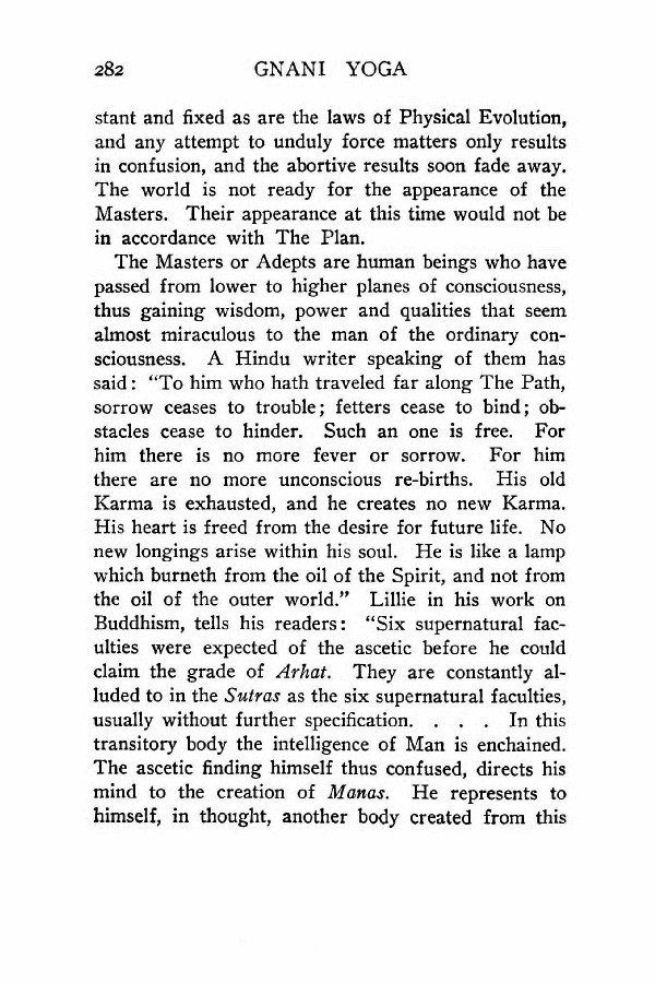 The Masters or Adepts are human beings who have passed from lower to higher planes of consciousness, thus gaining wisdom, power and qualities that seem almost miraculous to the man of the ordinary consciousness. A Hindu writer speaking of them has said: "To him who hath traveled far along The Path, sorrow ceases to trouble; fetters cease to bind; obstacles cease to hinder. Such an one is free. For him there is no more fever or sorrow. For him there are no more unconscious re-births. His old Karma is exhausted, and he creates no new Karma. His heart is freed from the desire for future life. No new longings arise within his soul. He is like a lamp which burneth from the oil of the Spirit, and not from the oil of the outer world." Lillie in his work on Buddhism, tells his readers: "Six supernatural faculties were expected of the ascetic before he could claim the grade of Arhat. They are constantly alluded to in the Sutras as the six supernatural faculties, usually without further specification. ... In this transitory body the intelligence of Man is enchained. The ascetic finding himself thus confused, directs his mind to the creation of Manas. He represents to himself, in thought, another body created from this