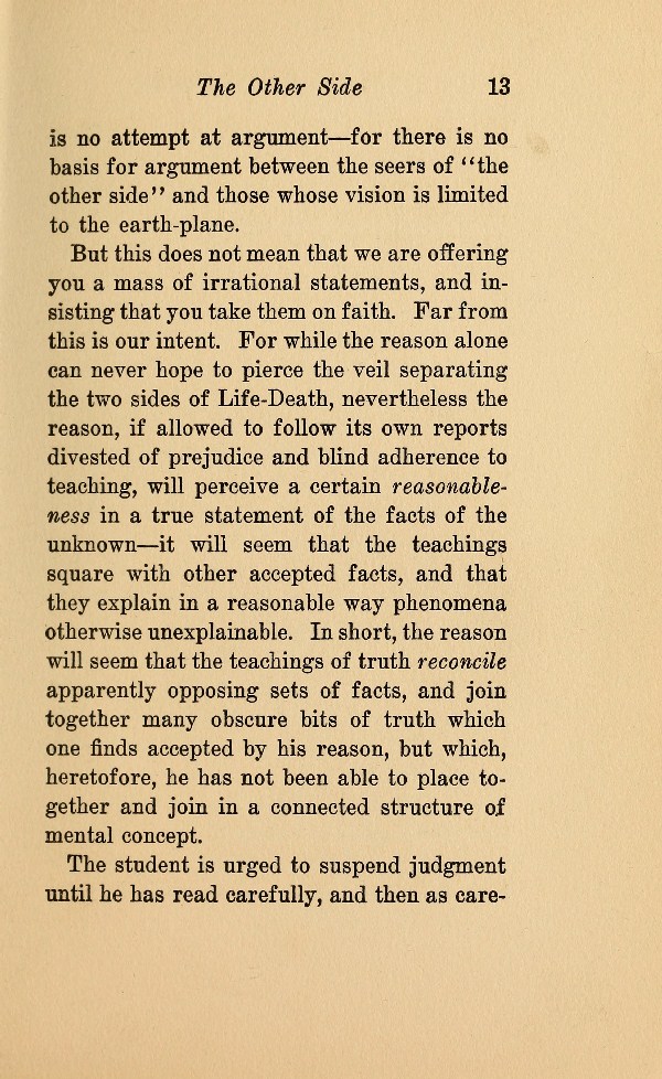 But this does not mean that we are offering you a mass of irrational statements, and insisting that you take them on faith. Far from this is our intent. For while the reason alone can never hope to pierce the veil separating the two sides of Life-Death, nevertheless the reason, if allowed to follow its own reports divested of prejudice and blind adherence to teaching, will perceive a certain reasonableness in a true statement of the facts of the unknown --- it will seem that the teachings square with other accepted facts, and that they explain in a reasonable way phenomena otherwise unexplainable. In short, the reason will seem that the teachings of truth reconcile apparently opposing sets of facts, and join together many obscure bits of truth which one finds accepted by his reason, but which, heretofore, he has not been able to place together and join in a connected structure of mental concept.