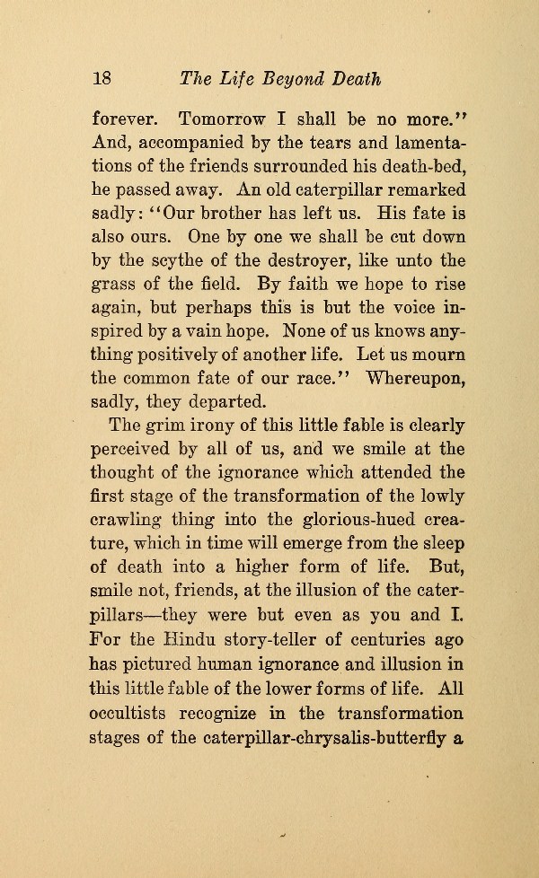 The grim irony of this little fable is clearly perceived by all of us, and we smile at the thought of the ignorance which attended the first stage of the transformation of the lowly crawling thing into the glorious-hued creature, which in time will emerge from the sleep of death into a higher form of life. But, smile not, friends, at the illusion of the caterpillars --- they were but even as you and I. For the Hindu story-teller of centuries ago has pictured human ignorance and illusion in this little fable of the lower forms of life. All occultists recognize in the transformation stages of the caterpillar-chrysalis-butterfly a