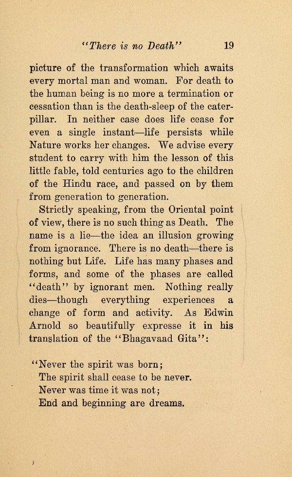 Strictly speaking, from the Oriental point of view, there is no such thing as Death. The name is a lie --- the idea an illusion growing from ignorance. There is no death --- there is nothing but Life. Life has many phases and forms, and some of the phases are called "death" by ignorant men. Nothing really dies --- though everything experiences a change of form and activity. As Edwin Arnold so beautifully expresses it in his translation of the "Bhagavaad Gita":