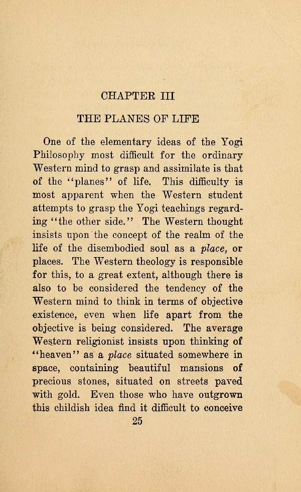 One of the elementary ideas of the Yogi Philosophy most difficult for the ordinary Western mind to grasp and assimilate is that of the "planes" of life. This difficulty is most apparent when the Western student attempts to grasp the Yogi teachings regarding "the other side." The Western thought insists upon the concept of the realm of the life of the disembodied soul as a place, or places. The Western theology is responsible for this, to a great extent, although there is also to be considered the tendency of the Western mind to think in terms of objective existence, even when life apart from the objective is being considered. The average Western religionist insists upon thinking of "heaven" as a place situated somewhere in space, containing beautiful mansions of precious stones, situated on streets paved with gold. Even those who have outgrown this childish idea find it difficult to conceive