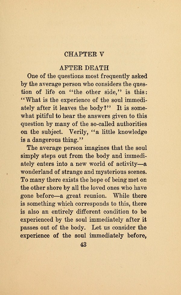 The average person imagines that the soul simply steps out from the body and immediately enters into a new world of activity --- a wonderland of strange and mysterious scenes. To many there exists the hope of being met on the other shore by all the loved ones who have gone before --- a great reunion. While there is something which corresponds to this, there is also an entirely different condition to be experienced by the soul immediately after it passes out of the body. Let us consider the experience of the soul immediately before,