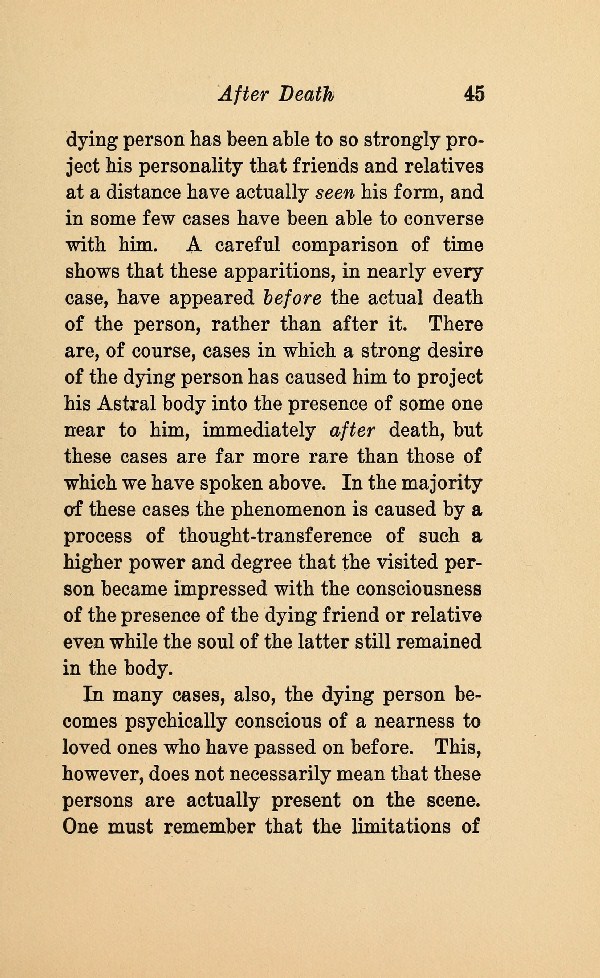 dying person has been able to so strongly project his personality that friends and relatives at a distance have actually seen his form, and in some few cases have been able to converse with him. A careful comparison of time shows that these apparitions, in nearly every case, have appeared before the actual death of the person, rather than after it. There are, of course, cases in which a strong desire of the dying person has caused him to project his Astral body into the presence of some one near to him, immediately after death, but these cases are far more rare than those of which we have spoken above. In the majority of these cases the phenomenon is caused by a process of thought-transference of such a higher power and degree that the visited person became impressed with the consciousness of the presence of the dying friend or relative even while the soul of the latter still remained in the body.