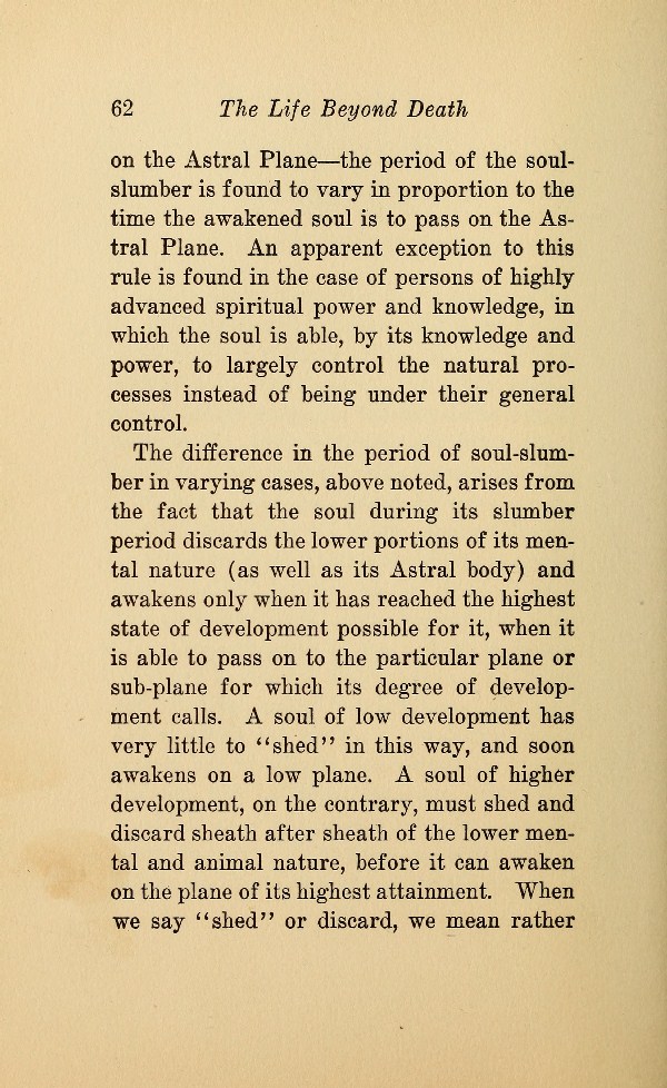 on the Astral Plane --- the period of the soulslumber is found to vary in proportion to the time the awakened soul is to pass on the Astral Plane. An apparent exception to this rule is found in the case of persons of highly advanced spiritual power and knowledge, in which the soul is able, by its knowledge and power, to largely control the natural processes instead of being under their general control.
