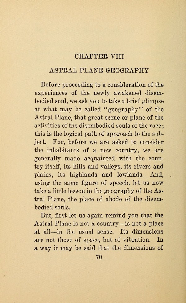 Before proceeding to a consideration of the experiences of the newly awakened disembodied soul, we ask you to take a brief glimpse at what may be called "geography" of the Astral Plane, that great scene or plane of the activities of the disembodied souls of the race this is the logical path of approach to the subject. For, before we are asked to consider the inhabitants of a new country, we are generally made acquainted with the country itself, its hills and valleys, its rivers and plains, its highlands and lowlands. And, using the same figure of speech, let us now take a little lesson in the geography of the Astral Plane, the place of abode of the disembodied souls.