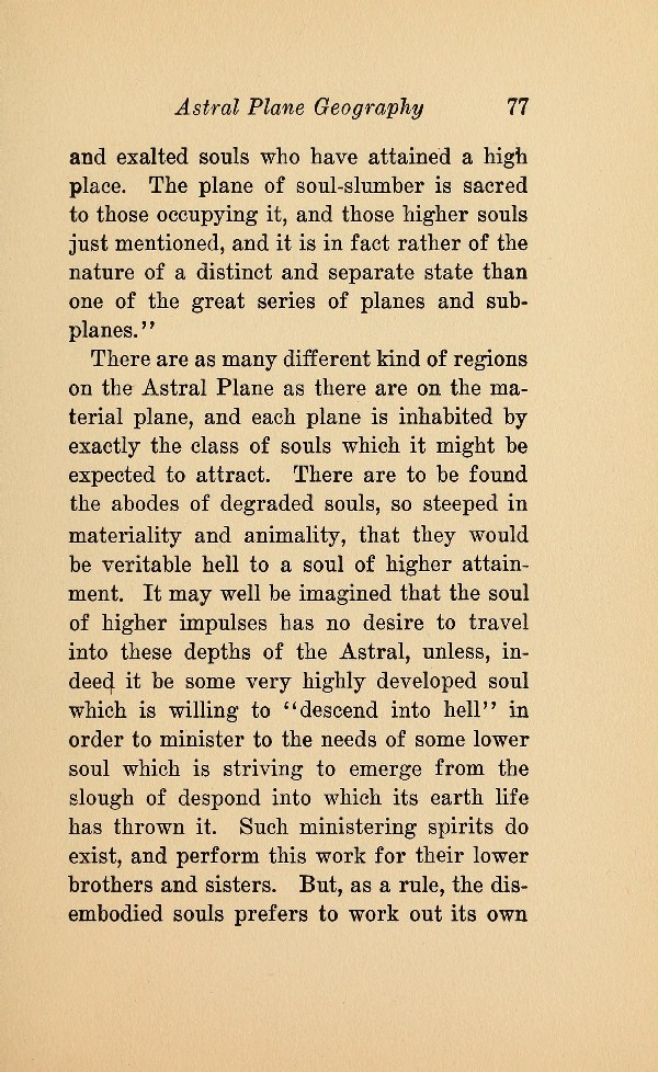 There are as many different kind of regions on the Astral Plane as there are on the material plane, and each plane is inhabited by exactly the class of souls which it might be expected to attract. There are to be found the abodes of degraded souls, so steeped in materiality and animality, that they would be veritable hell to a soul of higher attainment. It may well be imagined that the soul of higher impulses has no desire to travel into these depths of the Astral, unless, indeed it be some very highly developed soul which is willing to "descend into hell" in order to minister to the needs of some lower soul which is striving to emerge from the slough of despond into which its earth life has thrown it. Such ministering spirits do exist, and perform this work for their lower brothers and sisters. But, as a rule, the disembodied souls prefers to work out its own