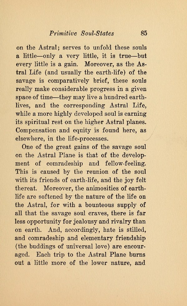 One of the great gains of the savage soul on the Astral Plane is that of the development of comradeship and fellow-feeling. This is caused by the reunion of the soul with its friends of earth-life, and the joy felt thereat. Moreover, the animosities of earthlife are softened by the nature of the life on the Astral, for with a bounteous supply of all that the savage soul craves, there is far less opportunity for jealousy and rivalry than on earth. And, accordingly, hate is stilled, and comradeship and elementary friendship (the buddings of universal love) are encouraged. Each trip to the Astral Plane burns out a little more of the lower nature, and