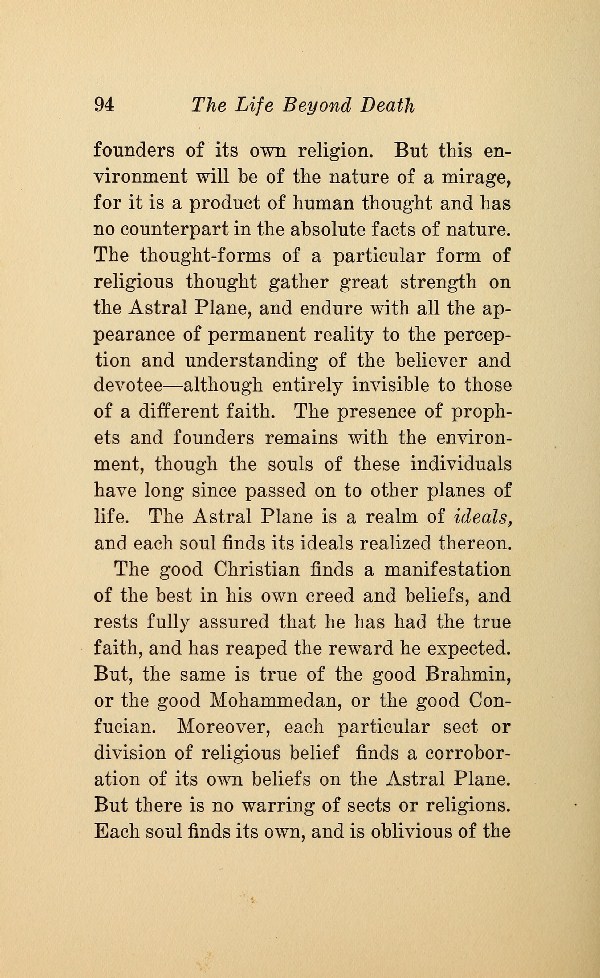 The good Christian finds a manifestation of the best in his own creed and beliefs, and rests fully assured that he has had the true faith, and has reaped the reward he expected. But, the same is true of the good Brahmin, or the good Mohammedan, or the good Confucian. Moreover, each particular sect or division of religious belief finds a corroboration of its own beliefs on the Astral Plane. But there is no warring of sects or religions. Each soul finds its own, and is oblivious of the