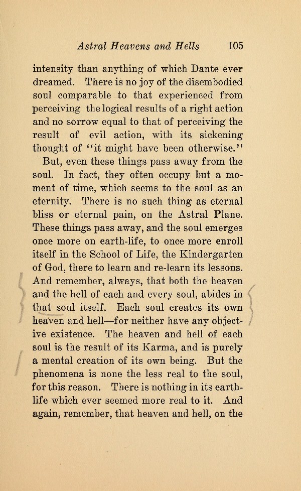 But, even these things pass away from the soul. In fact, they often occupy but a moment of time, which seems to the soul as an eternity. There is no such thing as eternal bliss or eternal pain, on the Astral Plane. These things pass away, and the soul emerges once more on earth-life, to once more enroll itself in the School of Life, the Kindergarten of God, there to learn and re-learn its lessons. And remember, always, that both the heaven and the hell of each and every soul, abides in that soul itself. Each soul creates its own heaven and hell --- for neither have any objective existence. The heaven and hell of each soul is the result of its Karma, and is purely a mental creation of its own being. But the phenomena is none the less real to the soul, for this reason. There is nothing in its earthlife which ever seemed more real to it. And again, remember, that heaven and hell, on the