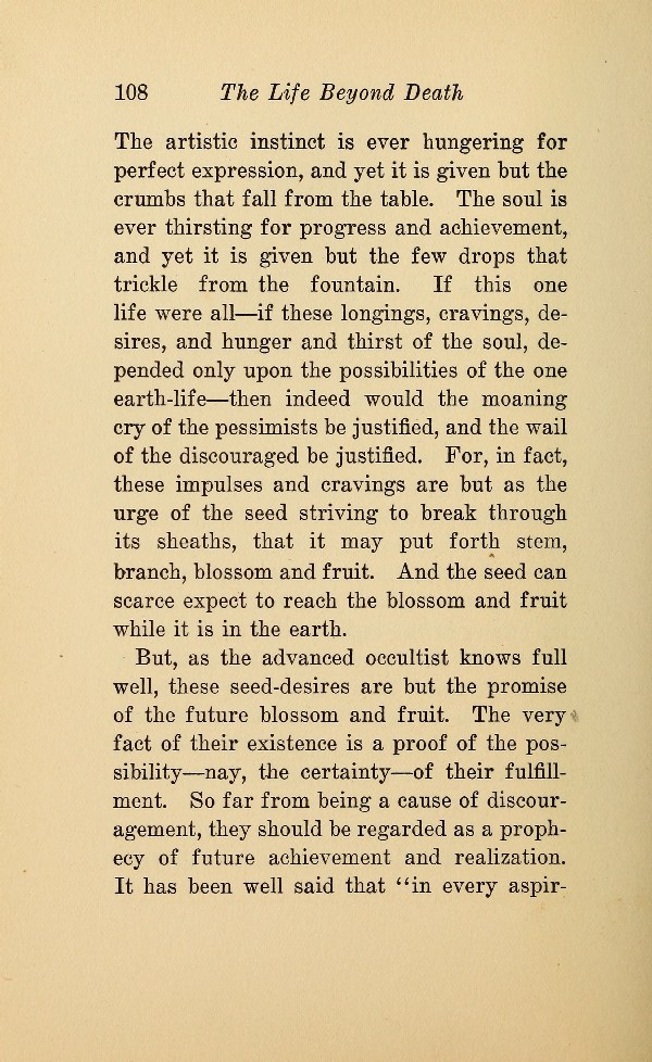 The artistic instinct is ever hungering for perfect expression, and yet it is given but the crumbs that fall from the table. The soul is ever thirsting for progress and achievement, and yet it is given but the few drops that trickle from the fountain. If this one life were all --- if these longings, cravings, desires, and hunger and thirst of the soul, depended only upon the possibilities of the one earth-life --- then indeed would the moaning cry of the pessimists be justified, and the wail of the discouraged be justified. For, in fact, these impulses and cravings are but as the urge of the seed striving to break through its sheaths, that it may put forth stem, branch, blossom and fruit. And the seed can scarce expect to reach the blossom and fruit while it is in the earth.