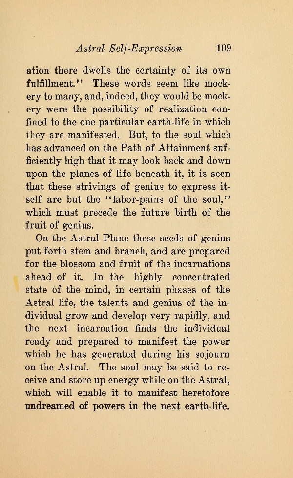 On the Astral Plane these seeds of genius put forth stem and branch, and are prepared for the blossom and fruit of the incarnations ahead of it. In the highly concentrated state of the mind, in certain phases of the Astral life, the talents and genius of the individual grow and develop very rapidly, and the next incarnation finds the individual ready and prepared to manifest the power which he has generated during his sojourn on the Astral. The soul may be said to receive and store up energy while on the Astral, which will enable it to manifest heretofore undreamed of powers in the next earth-life.