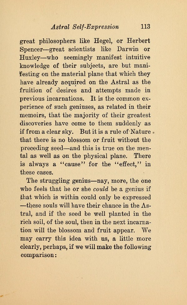 The struggling genius --- nay, more, the one who feels that he or she could be a genius if that which is within could only be expressed --- these souls will have their chance in the Astral, and if the seed be well planted in the rich soil, of the soul, then in the next incarnation will the blossom and fruit appear. We may carry this idea with us, a little more clearly, perhaps, if we will make the following comparison: