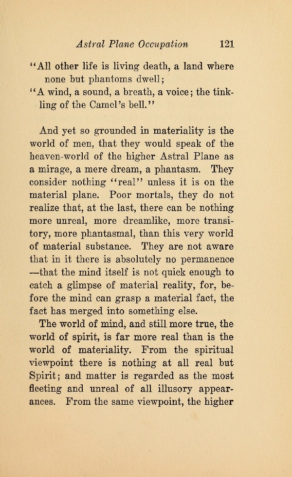 in the scale one rises above the material plane, the more real becomes the phenomena experienced. Therefore, it follows, that the experiences of the soul on the higher Astral Plane are not only not unreal in nature, but, by comparison, are far more real than the experiences of life on the material plans. As the writers just quoted have well said, Nature is not cheated on the Astral Plane --- but Nature herself manifests with more real effect on that plane than on the material plane. This is a hard saying for the uninitiated --- but the advanced soul becomes more and more convinced of its truth every succeeding hour of its experience.