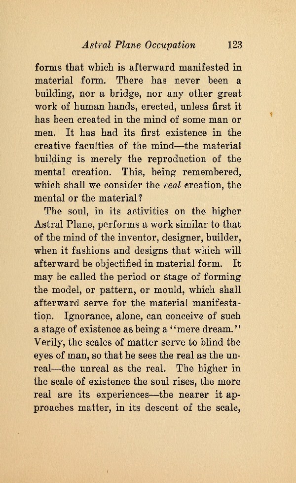 The soul, in its activities on the higher Astral Plane, performs a work similar to that of the mind of the inventor, designer, builder, when it fashions and designs that which will afterward be objectified in material form. It may be called the period or stage of forming the model, or pattern, or mould, which shall afterward serve for the material manifestation. Ignorance, alone, can conceive of such a stage of existence as being a "mere dream." Verily, the scales of matter serve to blind the eyes of man, so that he sees the real as the unreal --- the unreal as the real. The higher in the scale of existence the soul rises, the more real are its experiences --- the nearer it approaches matter, in its descent of the scale,