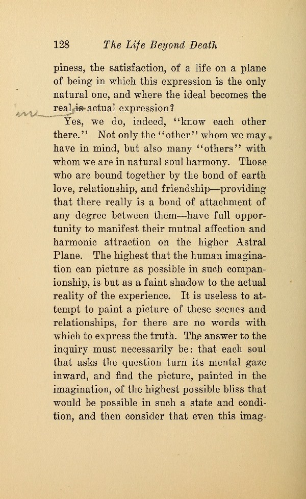 Yes, we do, indeed, "know each other there." Not only the "other" whom we may have in mind, but also many " others" with whom we are in natural soul harmony. Those who are bound together by the bond of earth love, relationship, and friendship --- providing that there really is a bond of attachment of any degree between them --- have full opportunity to manifest their mutual affection and harmonic attraction on the higher Astral Plane. The highest that the human imagination can picture as possible in such companionship, is but as a faint shadow to the actual reality of the experience. It is useless to attempt to paint a picture of these scenes and relationships, for there are no words with which to express the truth. The answer to the inquiry must necessarily be: that each soul that asks the question turn its mental gaze inward, and find the picture, painted in the imagination, of the highest possible bliss that would be possible in such a state and condition, and then consider that even this imaginary