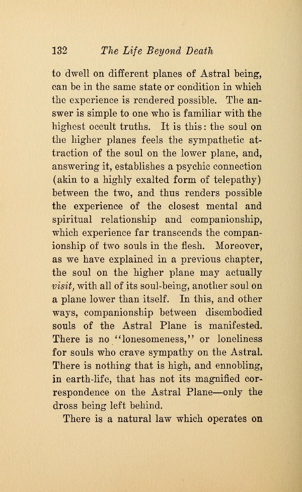 to dwell on different planes of Astral being, can be in the same state or condition in which the experience is rendered possible. The answer is simple to one who is familiar with the highest occult truths. It is this: the soul on the higher planes feels the sympathetic attraction of the soul on the lower plane, and, answering it, establishes a psychic connection (akin to a highly exalted form of telepathy) between the two, and thus renders possible the experience of the closest mental and spiritual relationship and companionship, which experience far transcends the companionship of two souls in the flesh. Moreover, as we have explained in a previous chapter, the soul on the higher plane may actually visit, with all of its soul-being, another soul on a plane lower than itself. In this, and other ways, companionship between disembodied souls of the Astral Plane is manifested. There is no "lonesomeness," or loneliness for souls who crave sympathy on the Astral. There is nothing that is high, and ennobling, in earth-life, that has not its magnified correspondence on the Astral Plane --- only the dross being left behind.
