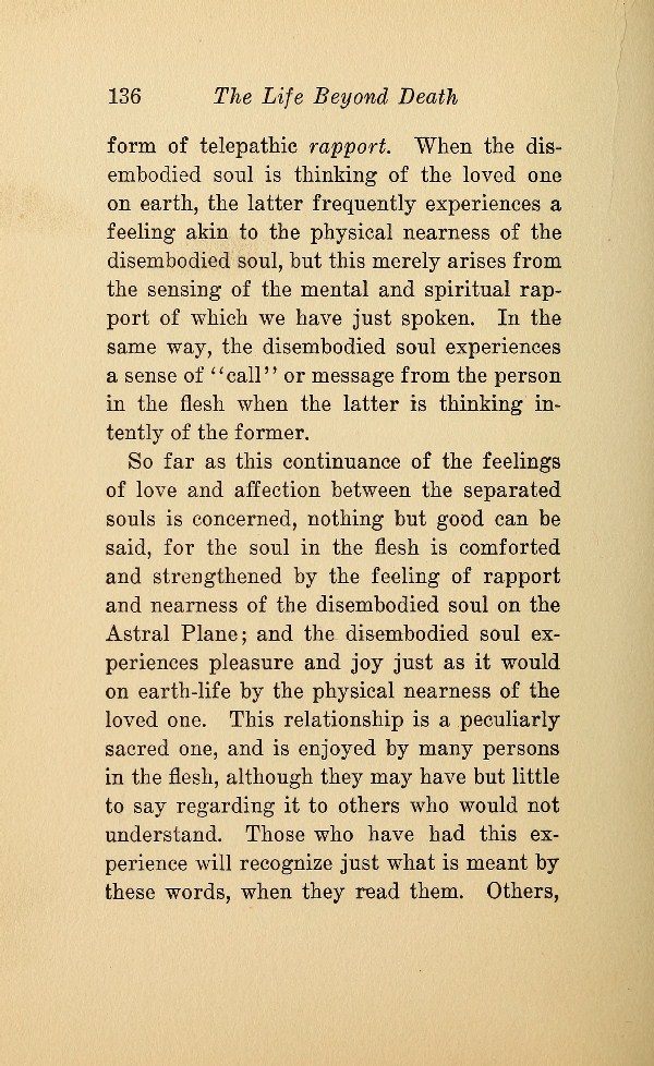 form of telepathic rapport. When the disembodied soul is thinking of the loved one on earth, the latter frequently experiences a feeling akin to the physical nearness of the disembodied soul, but this merely arises from the sensing of the mental and spiritual rapport of which we have just spoken. In the same way, the disembodied soul experiences a sense of "call" or message from the person in the flesh when the latter is thinking intently of the former.